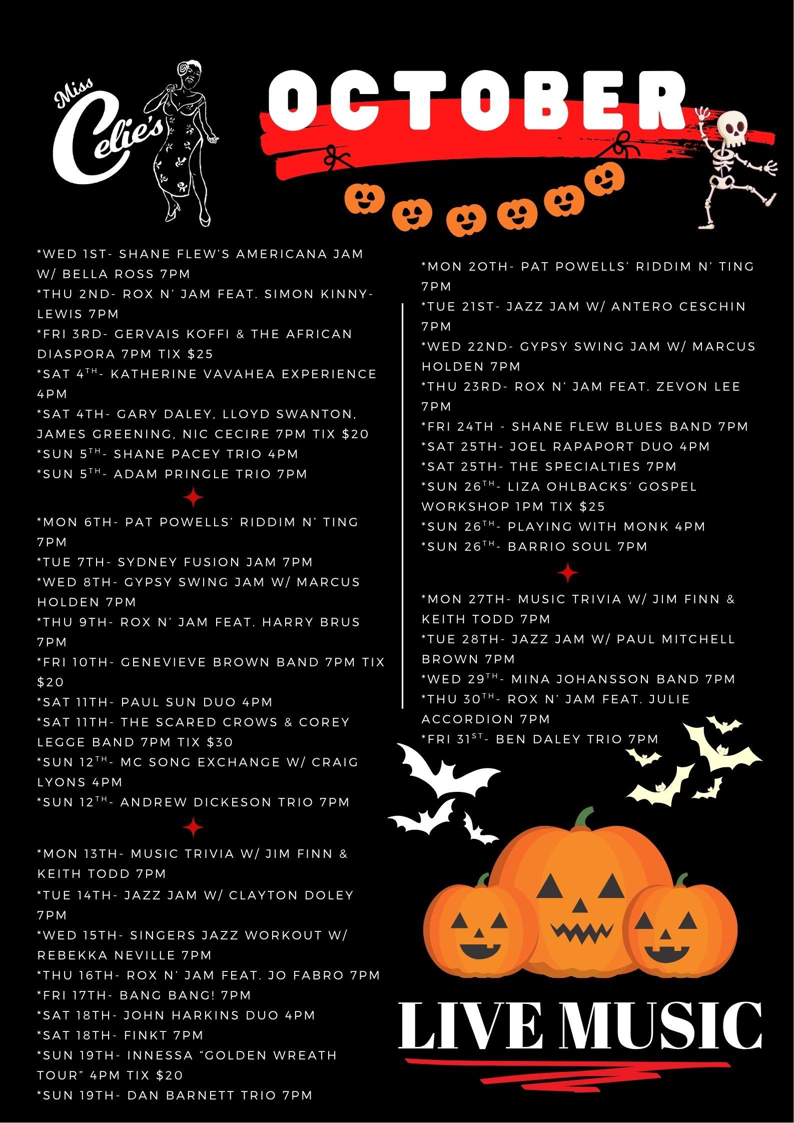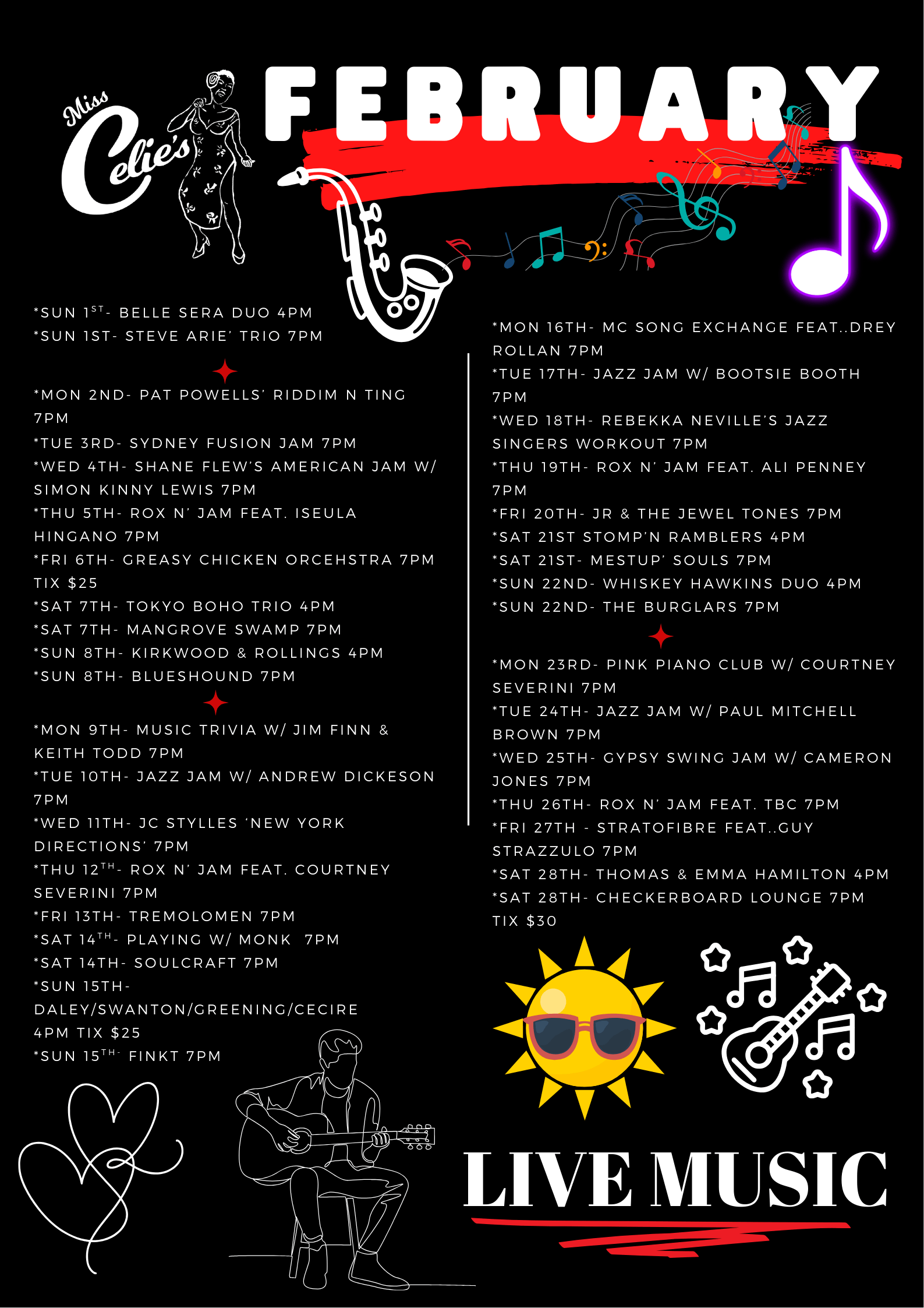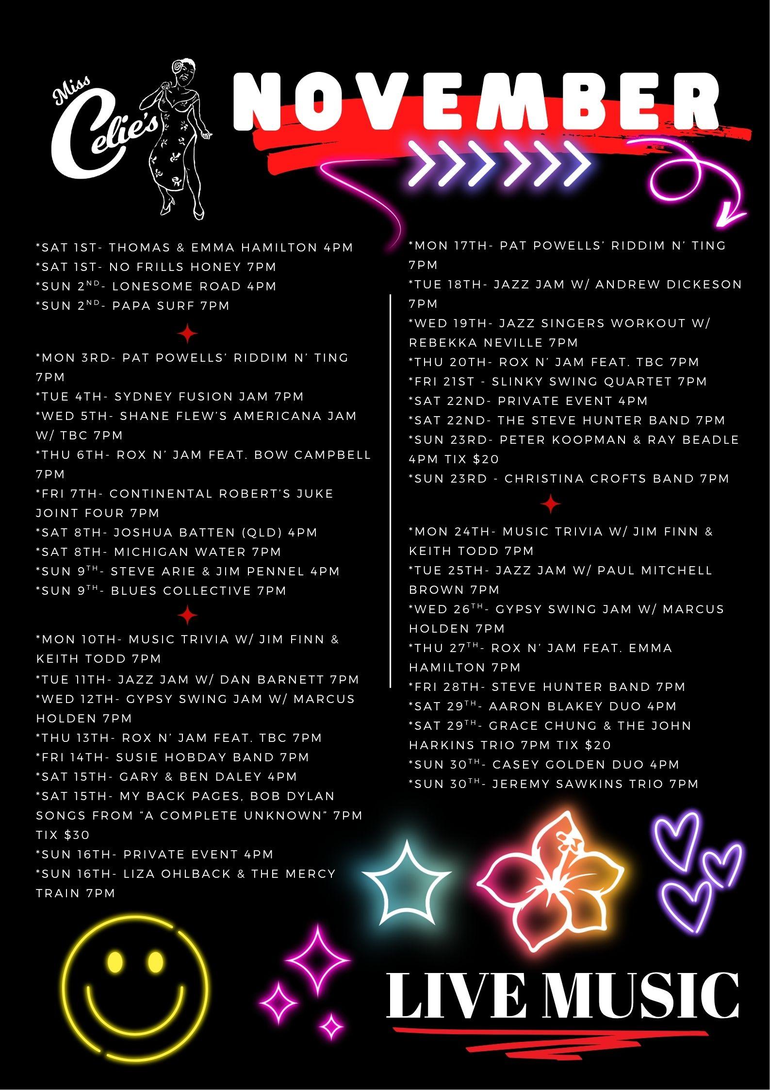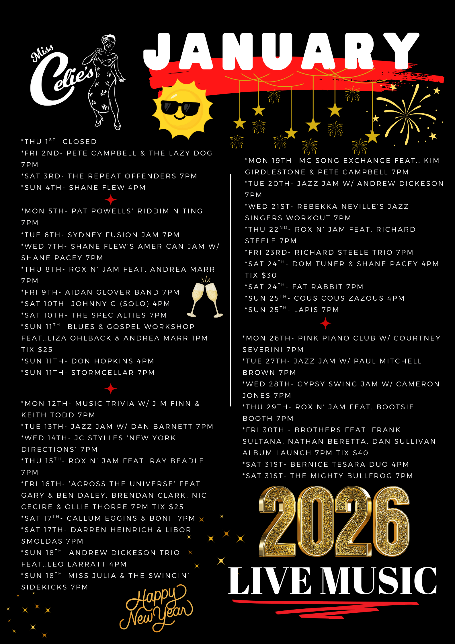 Miss Celie’s is a local community Bar & Kitchen featuring live music 7 nights a week. Specialising in the Jazz & the Blues (other genres may be accepted sometimes too) 😂 its a broad church after all…